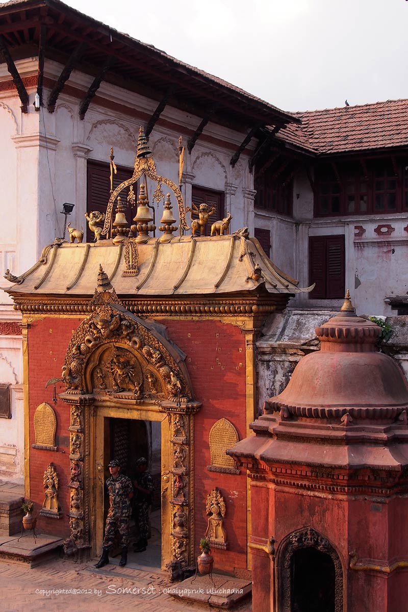 คราวนี้ขอเข้าไปด้านในพระราชวัง 55พระแกล ซะหน่อย ให้สมกับเป็นวังต้องมีทหารถือปืนเฝ้าหน้าประตู เราก็ไม่แน่ใจว่าเค้าจะให้ผ่านหรือไม่ แต่พอชี้ที่ด้านในทหารยามก็พยักหน้าให้ผ่านเข้าไปได้ ด้านในนอกจากระเบียงไม้แกะสลักที่สวยงามแล้ว ก็มีวัดฮินดูที่ศักดิ์สิทธิ์ เช่นเคยห้ามถ่ายรูป เราก็เลยเกร่ไปที่สระน้ำสำหรับกษัตริย์ลงสรงน้ำที่นี ่