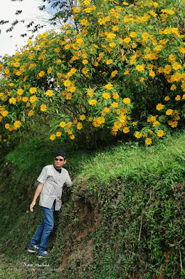 จุดหมายต่อไป คือไป อำเภอบ่อเกลือ แต่ก่อนไปบ่อเกลือ มีสมาชิก ขอไปออกนอกเส้นทางเพื่อแวะไปดูไร่กาแฟที่ วิสาหกิจกาแฟมณีพฤกษ์ บอกว่าไปไม่ไกลนัก แค่ 60 กม. หลังจากนั่งรถเวียนขึ้นเวียนลงตามโค้งถนนและผ่านเนินต่างๆ ได้พักนึง ทุกคนก็มีมติกันว่า ไม่ไหว กว่าจะถึงคงอ้วกซะก่อน จังหวะจะเลี้ยวกลับรถ เราก็เห็นบัวตองทุ่งเล็กซ่อนอยู่บนเนินเล็กๆ เท่านั้นทุกคนก็เฮกันลงรถ ไปถ่ายภาพทุ่งบัวตองกัน ชดเชยไร่กาแฟซะเลย
