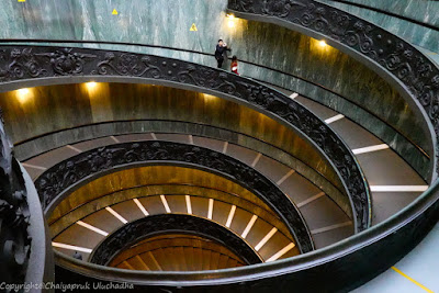 เข้ามาด้านใน จะเป็นโถงขายของที่ระลึก และใกล้ๆกันคือทางออก ที่ไม่ควรพลาดด้วยประการทั้งปวง คือบันใดเวียน ถ้าจะออกก่อน คือทางออกตรง Sistine Chapel เพื่อไป St. Peter's Basilica ก็ควรแวะบันไดเวียนซะก่อน